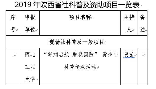 按照省科技之春领导小组办公室《关于开展陕西省第二十七届“科技之春”宣传月活动的通知》要求,省社科联下发了《关于申报2019年度陕西省社科普及活动资助项目的通知》(陕社科联〔2019〕5号),经过单位推荐,共申报了400余项科普活动。经过评审,确定立项101项,其中我院贺苗副教授申报的“翱翔启航 爱我国防” 青少年科普传承活动项目立项成功。现将获批项目予以公布。希望广大科研工作者继续努力,在各类基金项目的申报上积极主动,取得更大的突破,为太阳城app