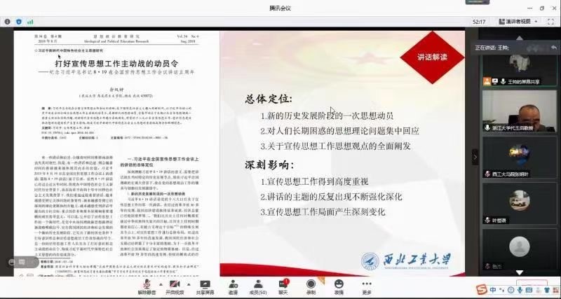 活动正式进入导读环节。首先,由我院硕士生文蒸玲同学进行导读,她具体分析解读了新形势下宣传思想工作的指导思想、十八大以来我党宣传工作取得的成绩和新形势下宣传思想工作的根本遵循等内容,着重谈到了习近平总书记此次讲话的时代价值,最后提出了自己的问题思考。紧接着由我院博士生王帅同学进行导读,他从背景简介、内容梳理、相关研究、启发收获这四个方面解读此次讲话内容与精神,他将《习近平2018年在全国宣传思想工作会议上的讲话》文本梳理为指导思想、根本遵循、中心环节、使命任务、战略任务和重要职责这六个部分,每个部分都做了详细的分析解读,同时梳理了大量相关且具有代表性的研究文献。在谈到启发收获时,王帅同学给参会师生分享了自己与此相关的研究成果,解读了文艺育德的内涵和在培养大学生中的功能定位、现实困境与解决办法。