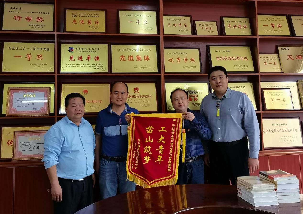 接着,双方就关于加强学生的人文关怀和心理疏导以及如何让团课、党课“有温度、接地气”等问题进行了深入探讨,未来双方将致力于精准对接民族中学学生的实际需求,继续开展深度合作。会后,融水苗族自治县民族中学校长首迎东和副校长陈慧宁向我院颁发“工大青年 苗山筑梦”锦旗,对我院捐赠系列图书表示感谢。