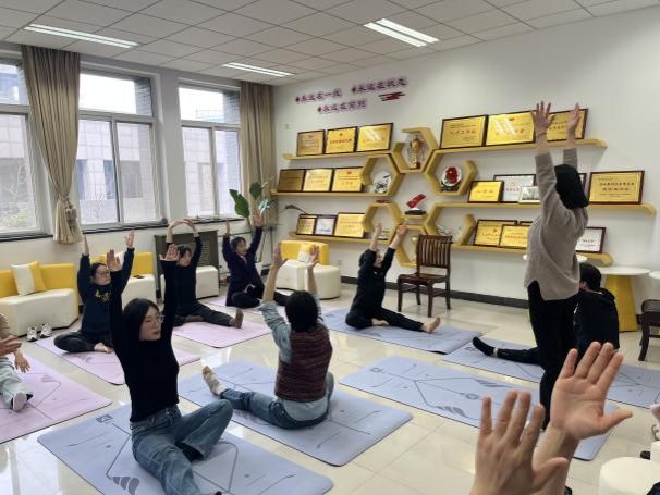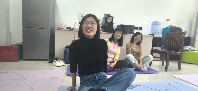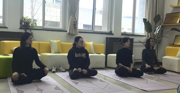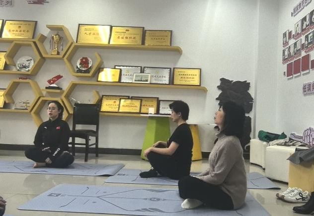 的女工们正在进行一场瑜伽体验课。大家围坐一堂,伸臂、屈膝、侧转、下压、闭眼、冥想,沉浸在运动带来的舒心与放松中。
