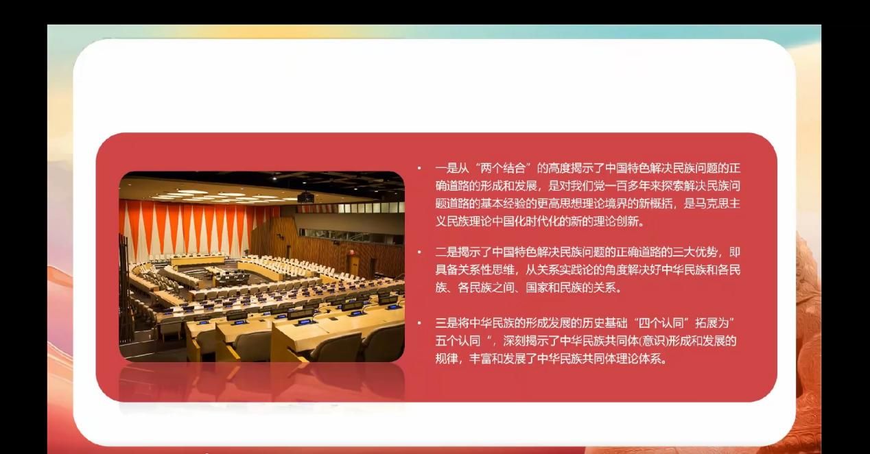 硕士生王海博同学,在认真研读《习近平:在全民族团结进步表彰大会上的讲话》的基础上,从核心概念辨析、民族理论创新、“两个结合”逻辑呈现和多层次实践进路四个部分进行学习分享。他认为中华优秀传统文化中的“和而不同”理念与马克思主义关于多样性统一的辩证思维高度契合。从文化根源上看,“和而不同”理念源远流长,是中华民族处理人际关系、族群关系的重要准则。在民族团结进步事业中,这一理念体现在对各民族文化多样性的尊重与包容上。