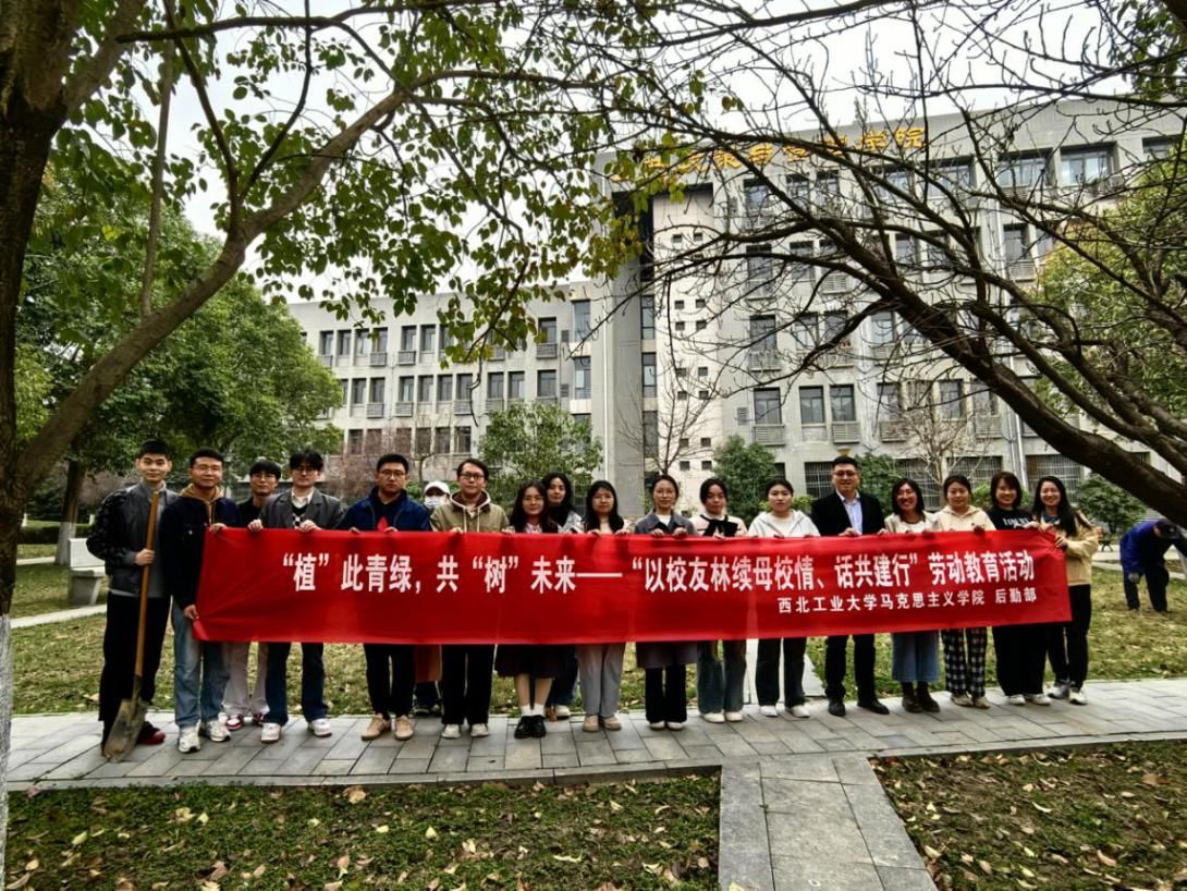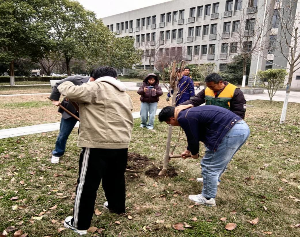 楼北侧开展“以校友林续母校情、话共建行”劳动教育活动。学院党委副书记耿云辉、学工主管刘敏、学院机关党支部成员、2025届毕业生及研一、研二学生代表与学校后勤部老师共二十余人挥锹培土,一起种下“劳育之树”“校友之树”“共建之树”,以劳动实践厚植生态文明理念,为学校增添绿色生机。
