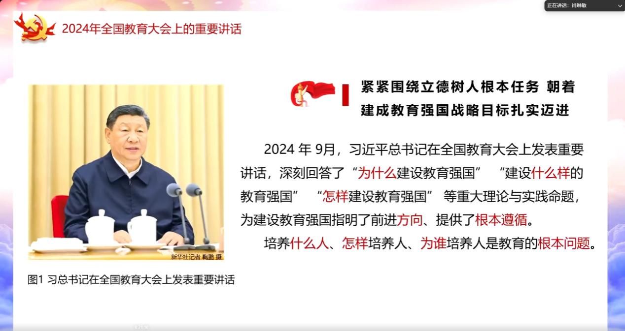 硕士生肖琳敏同学,从科学内涵、时代背景和实践路径三个方面对重要讲话内容进行了全面系统的梳理。同时,她表示要全面贯彻立德树人根本任务,扎实推进新时代教育高质量发展,为实现教育强国战略目标提供根本支撑,必须毫不动摇地坚持党对教育工作的全面领导,保障教育强国建设能够回应人民的切实教育需求,保障教育强国建设服务人的全面发展。