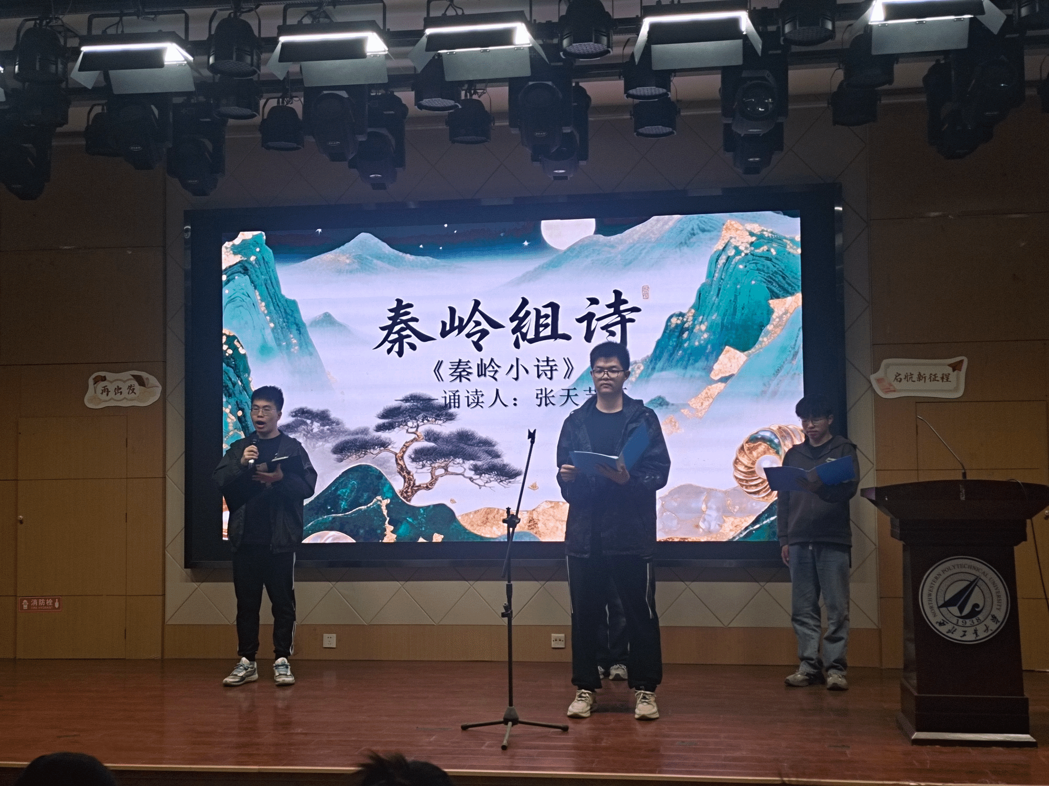207报告厅,参加诗歌朗诵会的同学经过抽签,筛选出来自全校的十个朗诵小组,现场朗诵并表演他们自创的诗歌作品,其余同学提交朗诵视频参赛。这些作品有的抒写家乡建设的成就、生态文明的奇迹,有的讴歌共和国筚路蓝缕的历程、祖国日新月异的巨变,有的表达对科技前辈的尊敬与仰望、科技喜报频传的自豪,有的遥想古路坝灯火、表达今日工大学子进取奋发的豪情,有的抒发青春理想、礼赞科技报国……现场诗声琅琅、同学们激情澎湃,展现出西工大学子奋进向上的昂扬风貌。