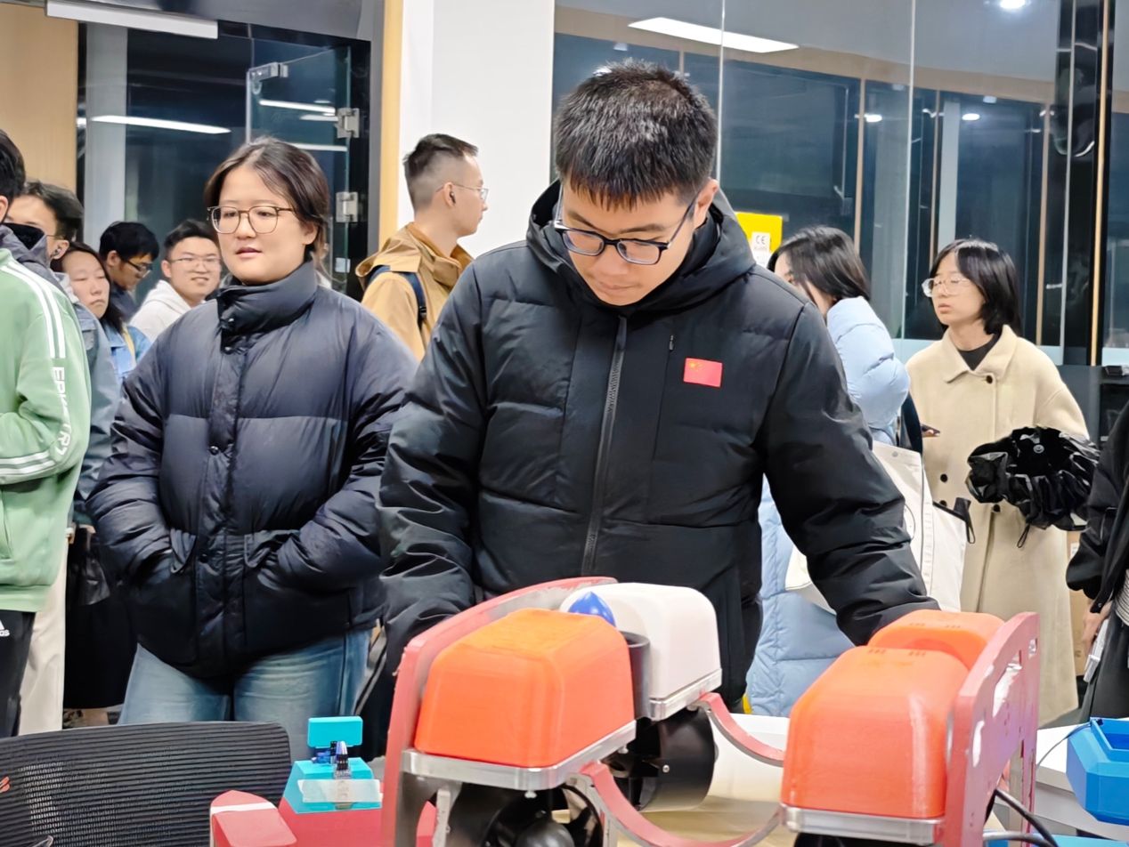随后带领学员系统参观创新实践社区,逐一讲解装配虚拟仿真实验室、智能制造示范中心等工作室的设备及其用途,并对“无人飞行器实验室”“机器人创新实践工坊”“创意孵化空间”等专项平台的功能定位及运行模式进行详细介绍,让同学们直观感受到科技创新实践场域的独特魅力,进一步激发了大家对工程实践的探索热情。通过详细解读多个创新项目成果转化的真实案例,梁老师生动论证了理论知识转化为工程应用的可行路径,有效增强了同学们对专业发展前景的信心。