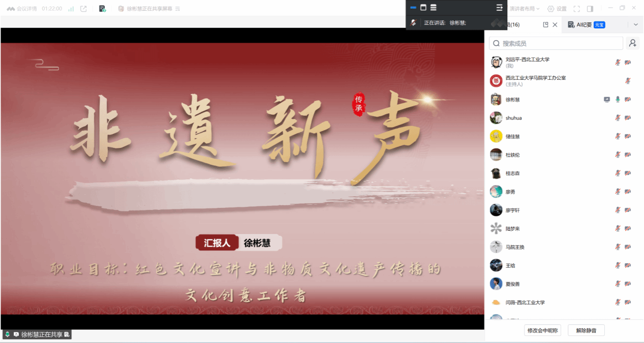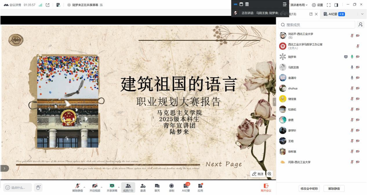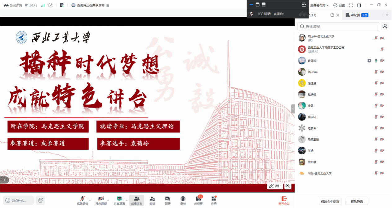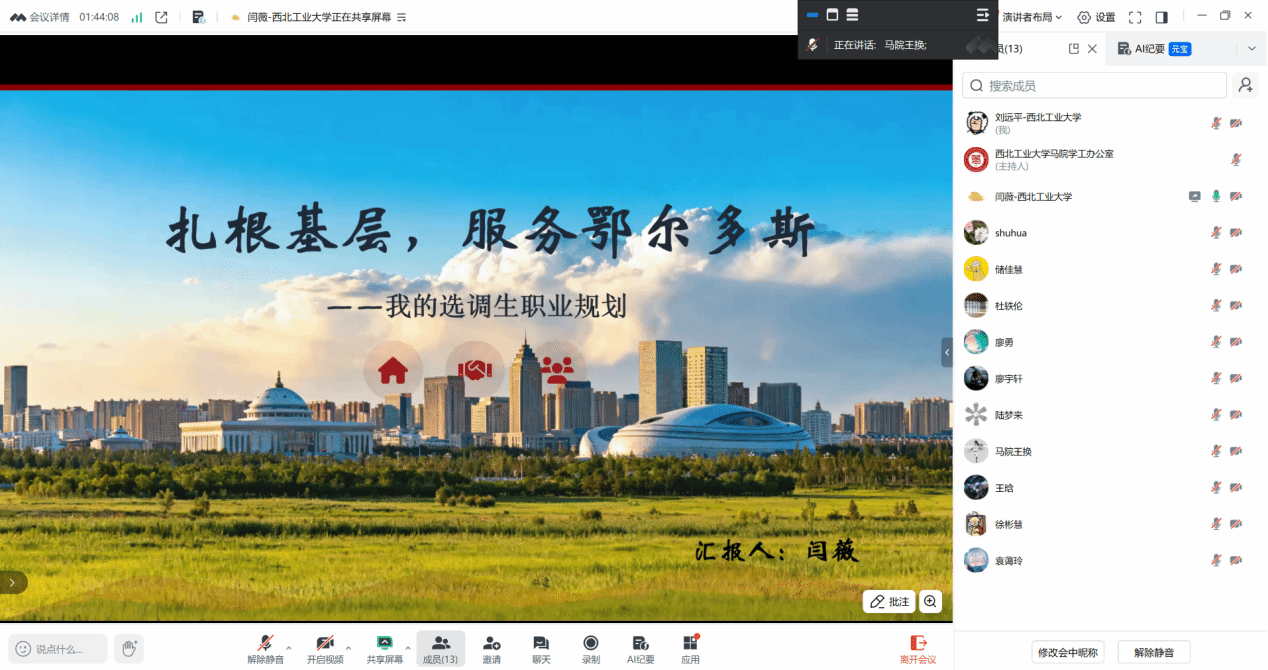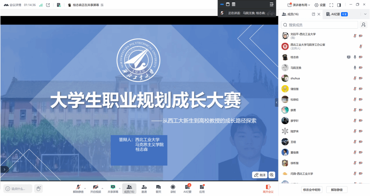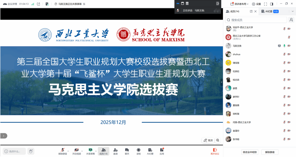 以线上形式顺利举行“第三届全国大学生职业规划大赛校级选拔赛暨西北工业大学第十届‘飞鲨杯’大学生职业生涯规划大赛”院级展示选拔赛。本次比赛邀请学院张淑华副教授、杜轶伦助理教授、王换助理教授担任评委,比赛由王换主持。