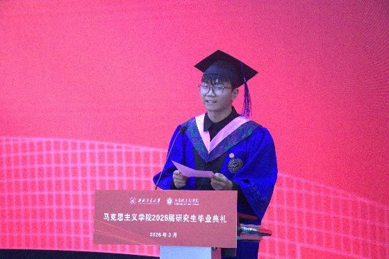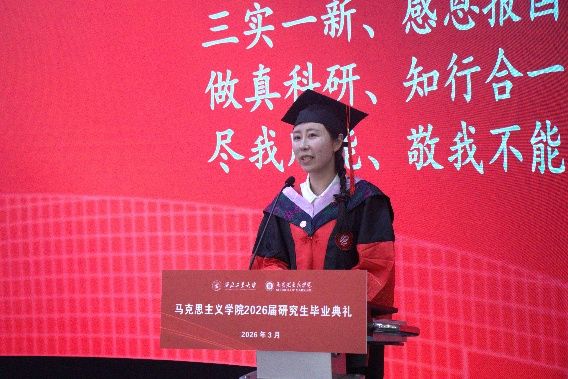 硕士优秀毕业生代表陈宗超、博士优秀毕业生代表石映昕依次发言。陈宗超对母校培育与师长教诲表达感恩,分享了自身理论学习与实践结合的成长感悟。石映昕围绕“三实一新、知行合一”分享科研心得,寄语同窗从容前行、不负韶华。