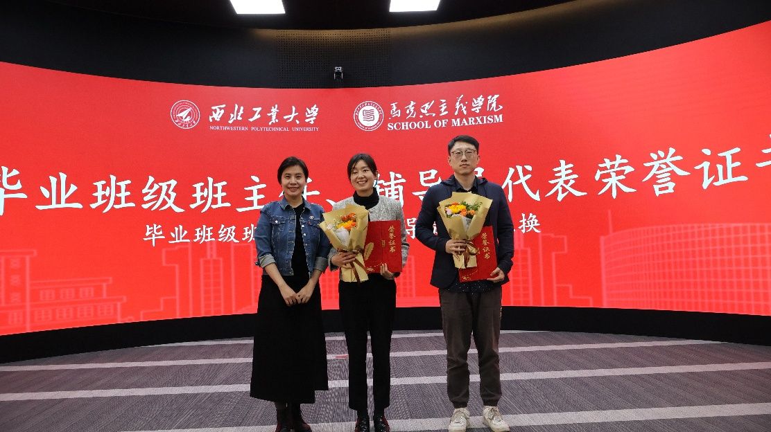 副院长贺苗为毕业班班主任吕焰、原辅导员代表王换颁发荣誉证书。