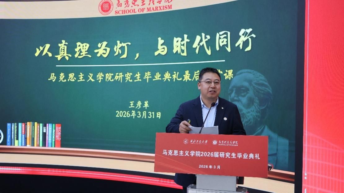 学院党委书记王彦革以“以真理为灯,与时代同行”为题,为全体毕业生讲授“最后一堂课”,引导青年学子运用唯物辩证的思想方法,科学认知、理性对待前进道路上的矛盾与挑战,努力成为真理的坚定信仰者、积极传播者、忠实践行者,将个人成长融入强国建设、民族复兴的伟大征程。